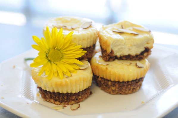 In a mixing bowl, add cream cheese, vanilla, sugar and eggs. Beat until light and fluffy. Spoon mixture into the muffin tins with prepared almond crust. Bake for 40 minutes.